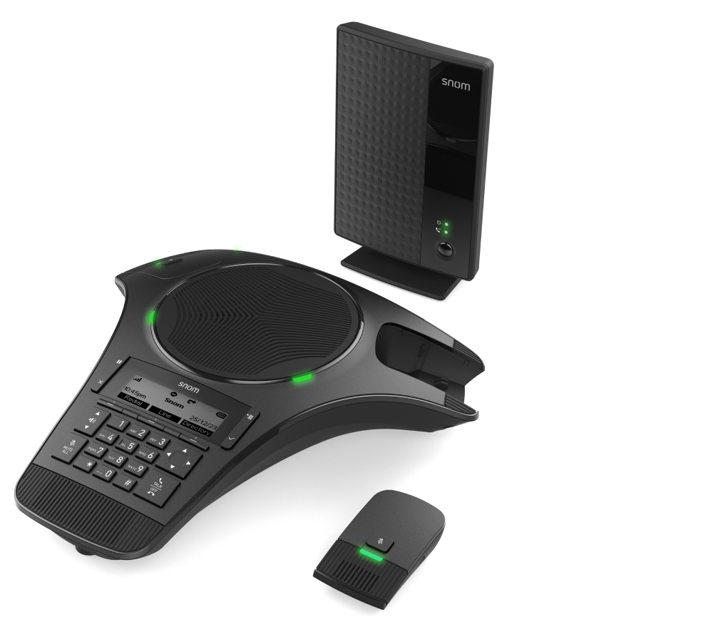 Das Snom C620 ist ein schnurloses DECT Konferenztelefon, das Schluss macht mit dem Kabelsalat auf- und unter dem Besprechungstisch! Das System umfasst eine SIP-DECT-Basisstation und eine Dockingstation zum Aufladen des Gerätes für bis zu 24 Stunden Sprechzeit (12 Stunden Breitband-Audio). Auch die integrierten Mikrofone sind kabellos und können frei über den Meetingtisch genutzt werden. Geladen werden die beiden kabellosen Mikrofone einfach über die integrierten Ladeschächte.