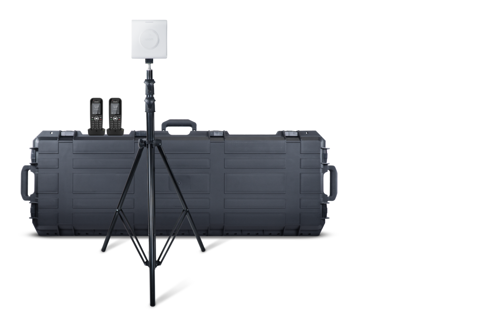 Para garantizar el funcionamiento eficaz de una red DECT, es necesario implementar una red de radio homogénea que asegure la conectividad y la cobertura en los distintos edificios y ubicaciones específicas de una red multicelular DECT. Con el kit de medición DECT, los instaladores pueden determinar la ubicación óptima para las estaciones base DECT. Para ello se necesita un trípode, dos teléfonos Snom M30 y una estación base DECT Snom M900 que funciona con batería, todos ellos incluidos en el kit. Para determinar la ubicación óptima, recomendamos utilizar al menos 2 o, mejor aún, 3 kits de medición DECT (especialmente para multiceldas con más de 50 bases) para garantizar que se pueda determinar fácilmente el número óptimo de conexiones redundantes durante la medición.