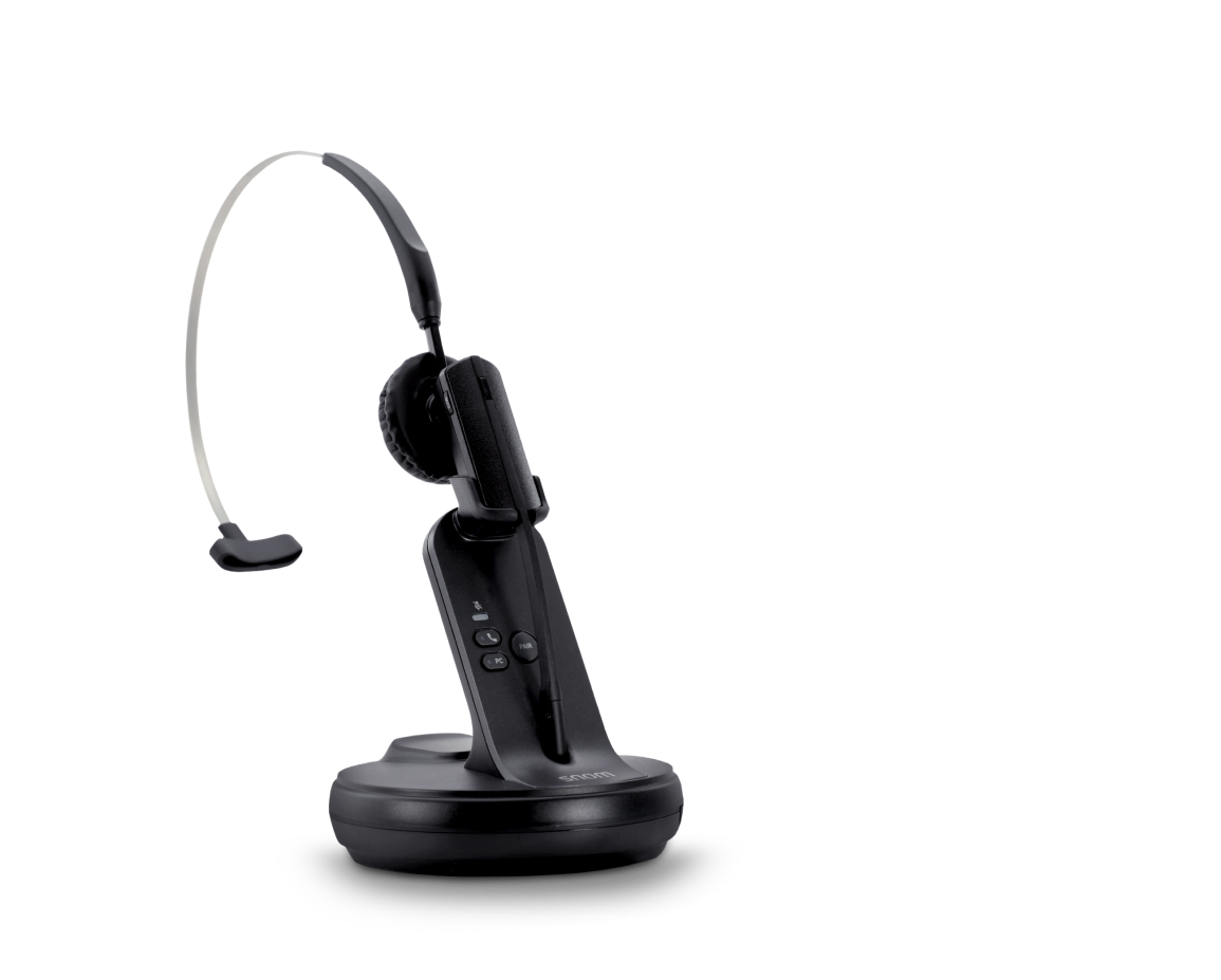 El Snom A170C ofrece tres opciones de uso flexibles: con diadema, con soporte de nuca o directamente en la oreja. Con la función EHS integrada, puede responder llamadas, ajustar el volumen o silenciar el micrófono, todo directamente desde el auricular.